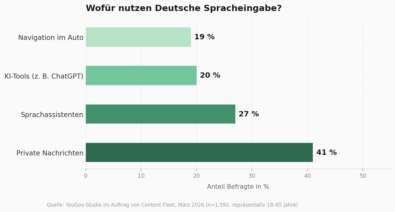Die Studiendaten zeigen, wie dringend das ist: 36 Prozent der Deutschen nutzen Spracheingabe heute bereits häufiger als noch vor zwei Jahren. 20 Prozent verwenden sie schon direkt für KI-Tools wie ChatGPT oder Gemini. Und besonders jüngere Zielgruppen — also jene, die heute Kaufentscheidungen vorbereiten und morgen Budgets verantworten — treiben den Wandel am stärksten.